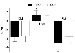 Changes in body composition during RT x higher protein (PRO: 2.4 g · kg−1 · d−1) and RT x lower protein diet (CON: 1.2 g · kg−1 · d−1 ).